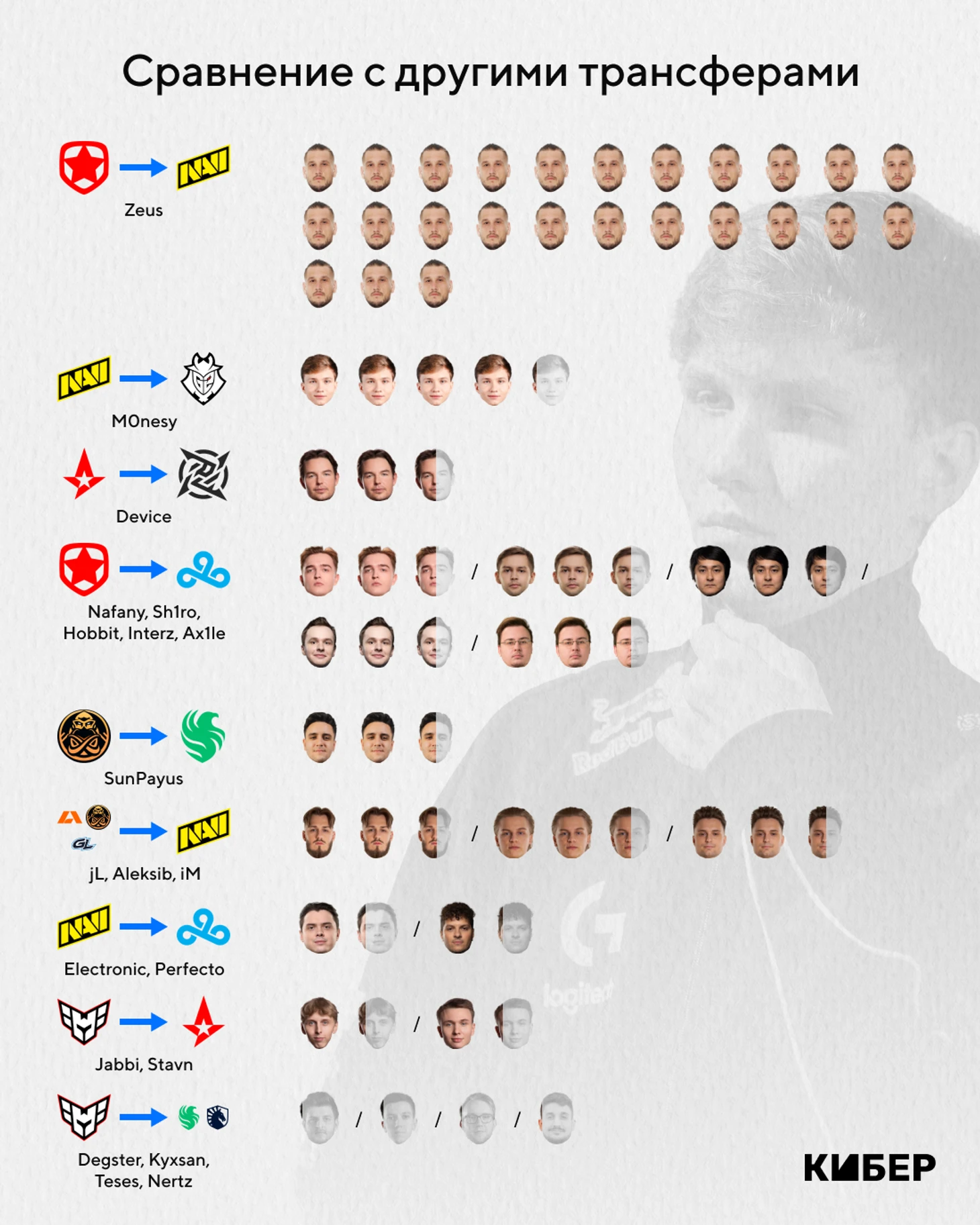 ● Трансфер Зевса в NAVI в 2017 году обошелся клубу всего в $100 тысяч – смешная сумма для нынешних сделок. Следующий капитан NAVI – Boombl4 – стоил уже $300 тысяч. А вот выкуп Jl, Aleksib и Im, по слухам, потребовал $1 миллион, что солиднее, но все равно сильно меньше, чем один Монеси.