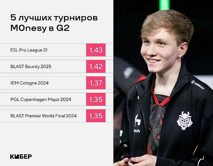 Забавно, что в пятерке лучших турниров Ильи в G2 лишь один победный – финал BLAST в 2024 году. Илья сыграл лучше уже на BLAST Bounty, IEM Cologne и мейджоре в Копенгагене в прошлом году. Всего же в G2 у Монеси было 11 топ-турниров, на которых он набил рейтинг выше 1,30.