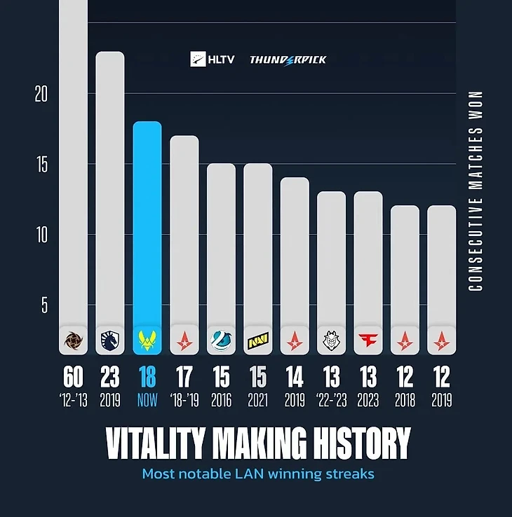 Новая эра близко, ведь команда Vitality крушит всех соперников одного за другим, и буквально сегодня побила рекорд Astralis на LAN-турнирах - 18 побед подряд (у датчан в период с 2018 по 2019 год было 17). До мегарекорда NiP слишком далеко - но тогда КС и в целом весь киберспорт были совсем уж другими, а вот достижение Liquid с винстриком в 23 матча подряд может и не устоять.