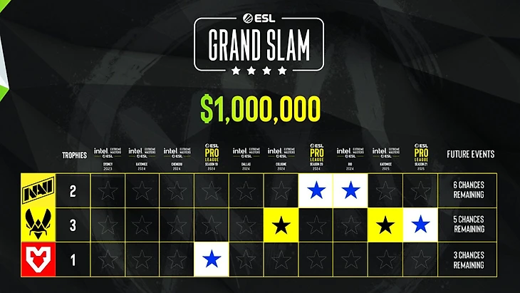 Напомню, что обладателем премии Grand Slam станет коллектив, который выиграет три ивента серии ESL Pro Tour плюс один крупный чемпионат элитной категории (IEM Cologne, IEM Katowice, или мейджор от ESL). С момента первого успеха у претендентов есть девять попыток на получение ещё трёх титулов.