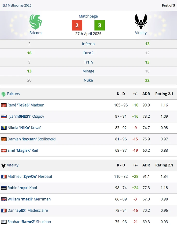 Каждая из команд взяла все свои пики, и, к огромной радости болельщиков, матч дошёл до пятой решающей карты. На Nuke коллективам понадобилось 3 овертайма, чтобы всё-таки определить лучшего, несмотря на то, что Falcons вели со счётом 12:6.
