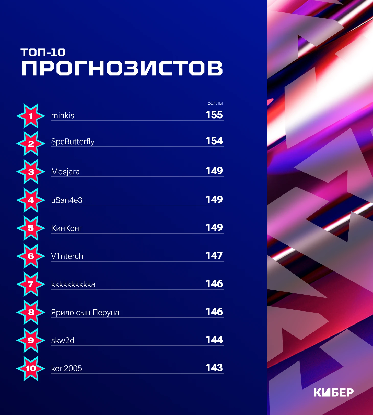 6-10-е места: V1nterch, kkkkkkkkkka, Ярило сын Перуна, skw2d и keri2005 получат по сертификату Ozon на 1000 рублей и фрибет 4000 рублей от BetBoom
