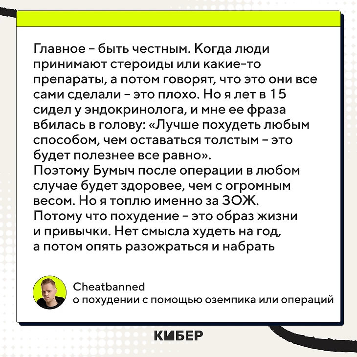 – Главное – быть честным. Когда люди принимают стероиды или какие-то препараты, а потом говорят, что они все сами сделали – это плохо. Но я лет в 15 сидел у эндокринолога, и мне ее фраза вбилась в голову: «Лучше похудеть любым способом, чем оставаться толстым – это будет полезнее все равно». Поэтому Бумыч после операции в любом случае будет здоровее, чем с огромным весом. Но я топлю именно за ЗОЖ. Потому что похудение – это образ жизни и привычки. Нет смысла худеть на год, а потом опять разожраться и набрать. Надо начинать с головы и нового образа жизни – тогда уже никакие таблетки или операции не потребуются.