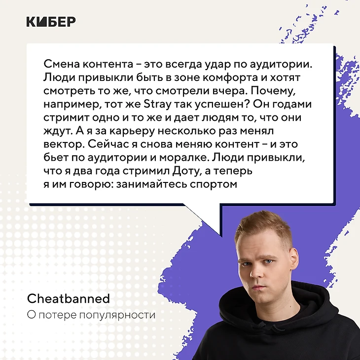 Такое было несколько раз: PUBG, Fortnite, Fall Guys, а потом уже похудение и IRL-контент. Смена контента – всегда удар по аудитории. Люди привыкли быть в зоне комфорта и хотят смотреть то же, что смотрели вчера. Почему, например, тот же Stray так успешен? Он годами стримит одно и то же и дает людям то, что они ждут. А я за карьеру несколько раз менял вектор. Сейчас я снова меняю контент, и это бьет по аудитории и моралке. Люди привыкли, что я два года стримил Доту, а теперь я им говорю: занимайтесь спортом.