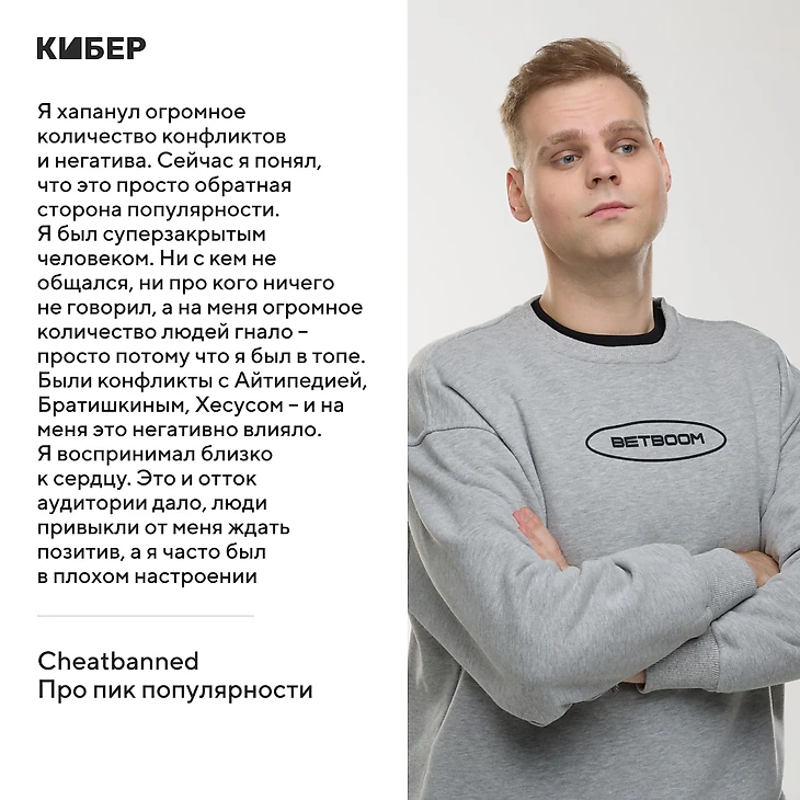 Но в этот пик я хапанул огромное количество конфликтов и негатива. Сейчас я понимаю, что это просто обратная сторона популярности. Я был суперзакрытым человеком. Ни с кем не общался, ни про кого ничего не говорил, а на меня огромное количество людей гнало – просто потому что я был в топе.