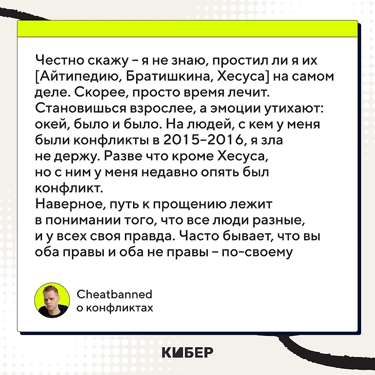 – Про старые конфликты хотел пару моментов уточнить. Ты говорил, что уже простил и Айтипедию, и Братишкина, и других. Как ты к этому пришел? Как прощать?