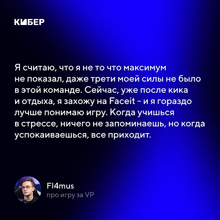 Но я считаю, что я не то что максимум не показал, даже трети моей силы не было в этой команде. Сейчас, уже после кика и отдыха, я захожу на Faceit – и гораздо лучше понимаю игру. Когда учишься в стрессе, ничего не запоминаешь, но когда успокаиваешься, все приходит.