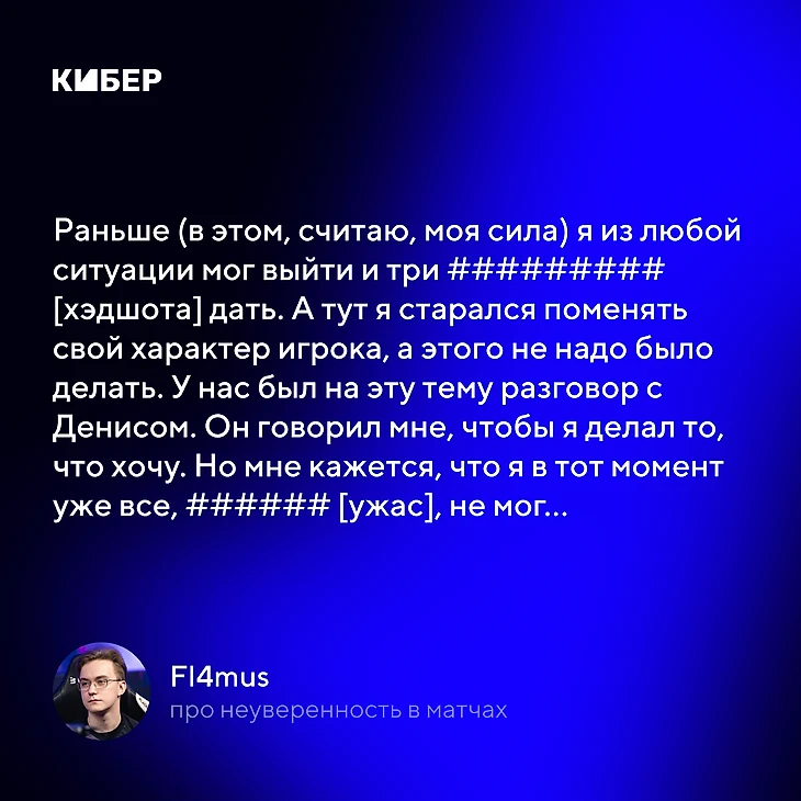 Раньше (в этом, считаю, моя сила) я из любой ситуации мог выйти и три ######### [хэдшота] дать. А тут я старался поменять свой характер игрока, а этого не надо было делать. У нас был на эту тему разговор с Денисом. Он говорил мне, чтобы я делал то, что хочу. Но мне кажется, что я в тот момент уже все, ###### [ужас], не мог…