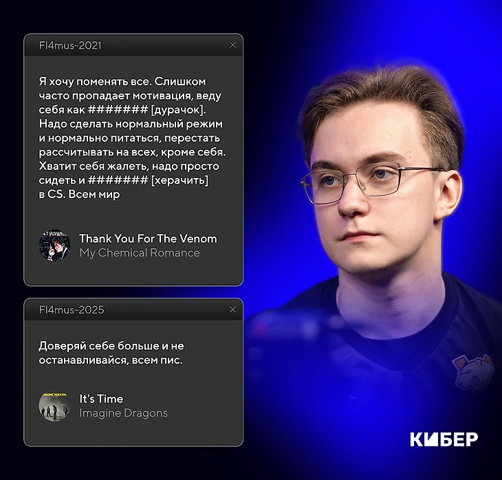 – В начале 2021-го ты написал то ли поздравление с Новым годом, то ли напутствие самому себе: «Короче, так как настал Новый год, новая глава в моей карьере, я хочу поменять все. Слишком часто пропадает мотивация, веду себя как ####### [дурачок]. Надо сделать нормальный режим и нормально питаться, перестать рассчитывать на всех, кроме себя. Хватит себя жалеть, надо просто сидеть и ####### [херачить] в CS. Всем мир». И ты приложил песню My Chemical Romance – Thank You For The Venom.