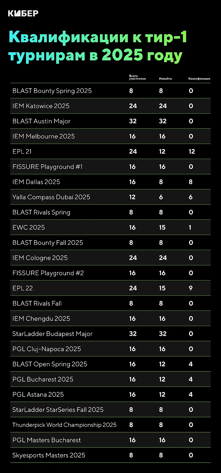 В 2025-м году на большинстве турниров вовсе нет квалификаций: они прошли (или планируются) только на 7 ивентах из 27. Открытой, как и раньше, остается ESL Pro League, куда можно попасть из ESL Challenger и региональных отборов. Выборочно открытые квалы также сохраняет PGL. В остальном – попасть на соревнования можно только по рейтингу Valve.