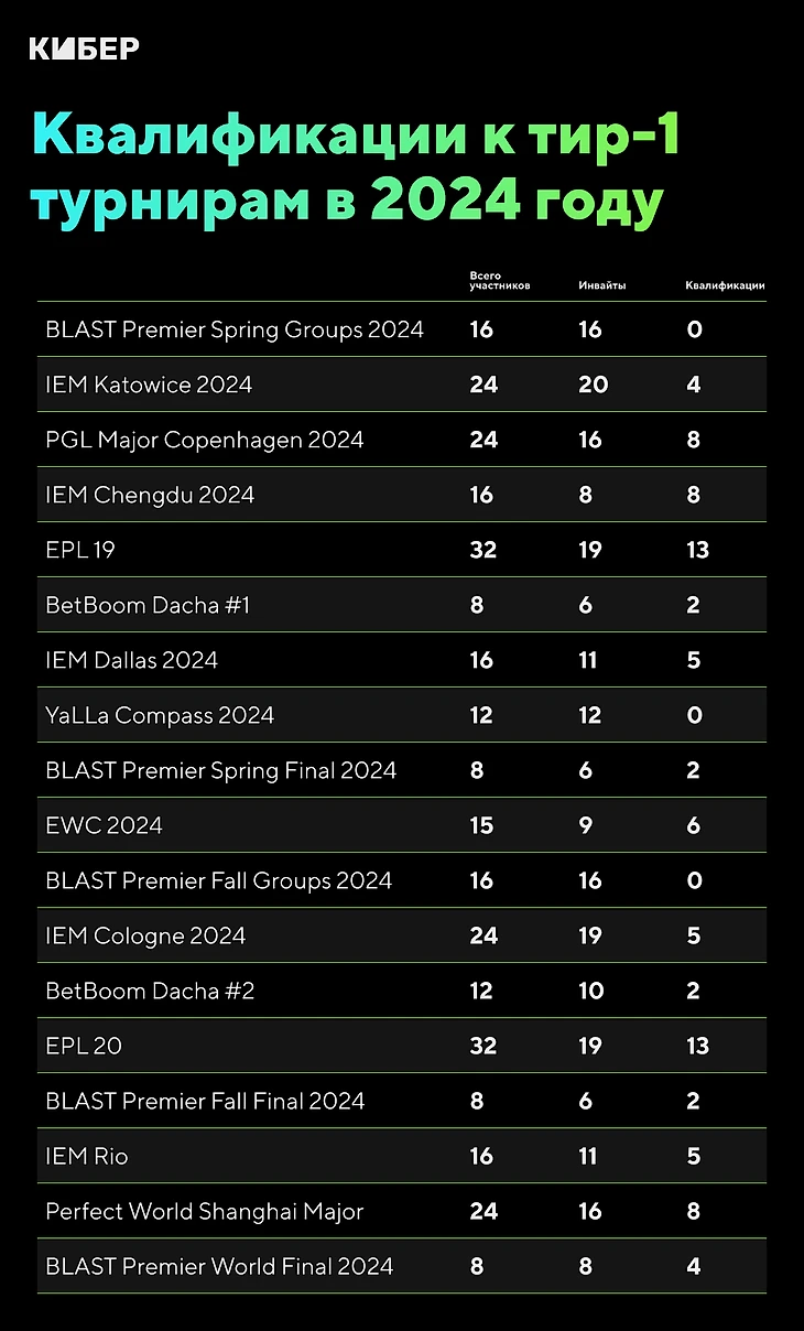Для сравнения, в 2024-м почти треть всех слотов на топ-турнирах разыгрывалась через квалификации (как раз возможность для средних команд себя проявить). Без отборов были только групповые стадии BLAST Premier c 16 командами-партнерами. Также тяжело было попасть на IEM Cologne и IEM Katowice – под них провели лишь одну полноценную квалификацию: для команд из Германии и Польши соответственно. Еще несколько путевок достались командам-победителям на других турнирах от ESL, куда можно было попасть через отборочные.