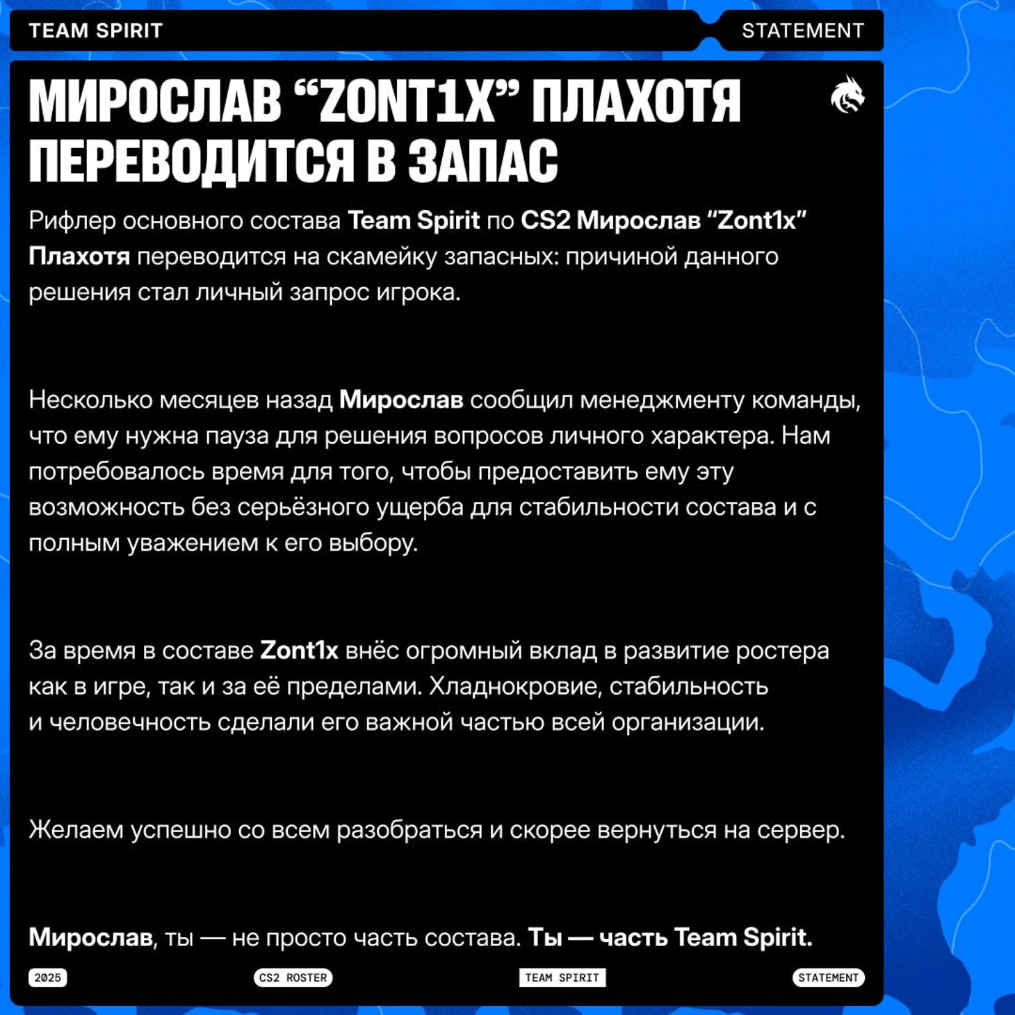 Spirit провернула самый неожиданный решаффл года: после окончания EWC (20-24 августа) команду покинет Мирослав «Zont1x» Плахотя, на его место придет Андрей «Tn1r» Татаринович из Heroic. В этом онлайне – все новости и мнения о переходе.