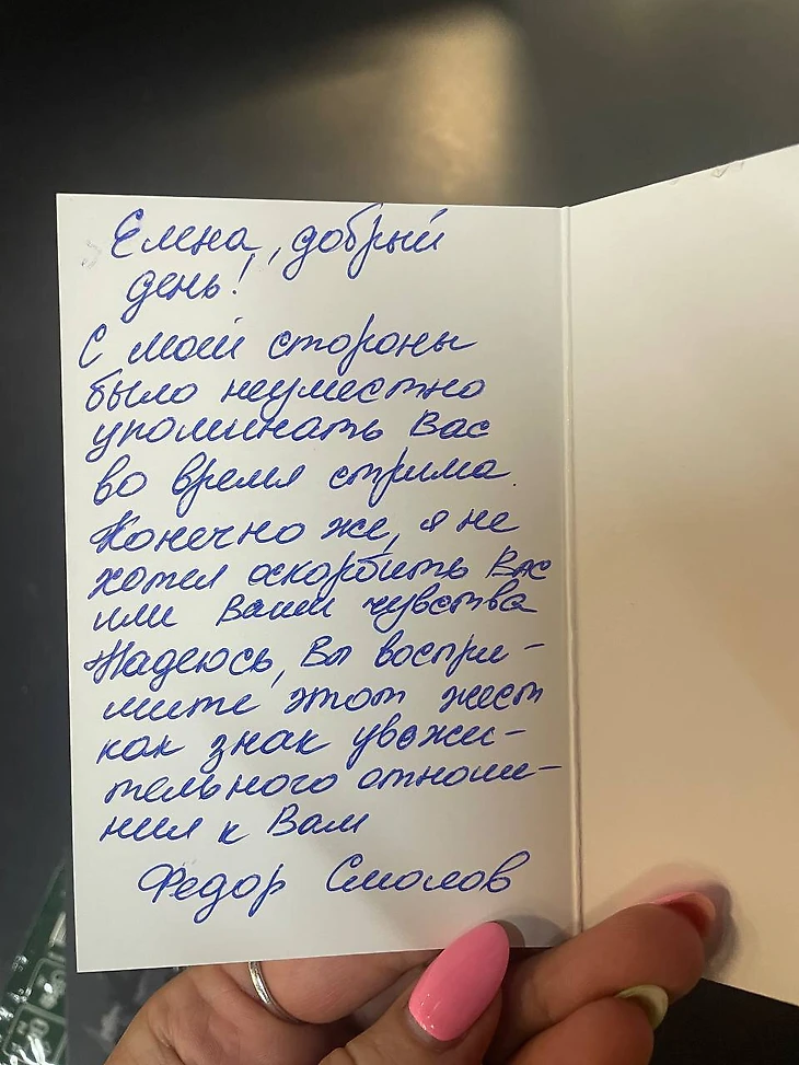 «Елена, добрый день. С моей стороны было неуместно упоминать вас во время стрима. Конечно же, не хотел оскорбить вас или ваши чувства. Надеюсь, вы воспримите этот жест как знак уважительного отношения к вам».