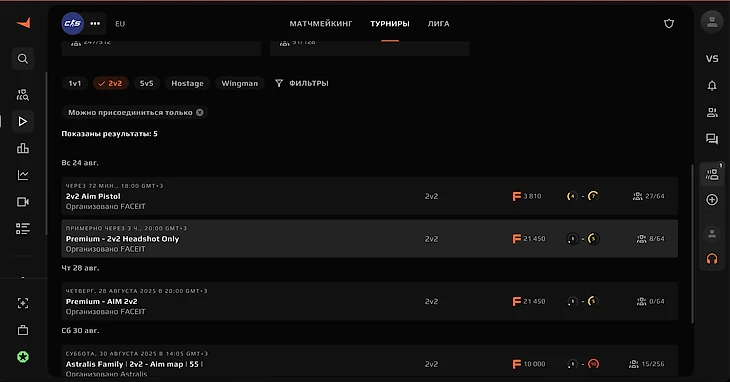 Пока это единственный способ сыграть в КС 2 на Faceit в режиме «Напарники». Во времена CS:GO был доступен стандартный поиск игр 2 на 2, но с выходом CS 2 остался только классический режим. Возможно, в будущем разработчики вернут обычный матчмейкинг для 2x2.