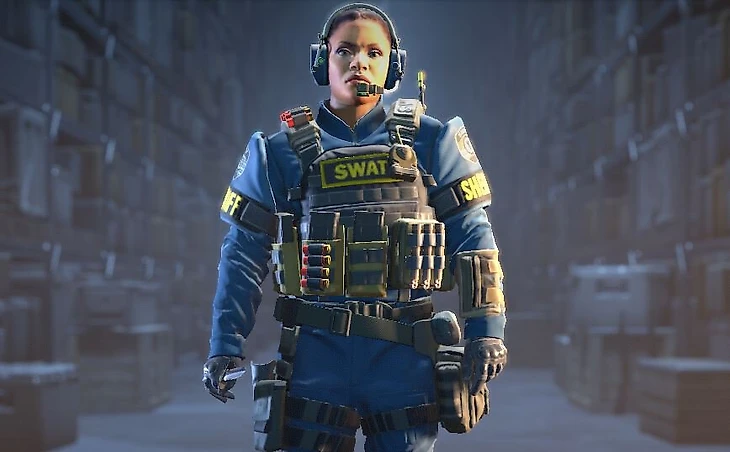 Женский агент, командир SWAT. Без шлема, надписи «Sheriff» на плечах.