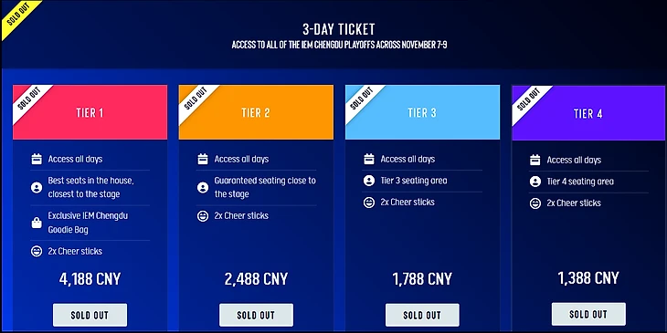 Билеты на турнир. ESL уже объявили о продаже билетов и первая волна уже вся распродана. Но, турнирный оператор объявил о нескольких подобных волн билетов. Но что по стоимости? Самый дешевый Tier-4 билет на все дни обойдется вам в 1 388 CNY (~ 16 000 ₽), а самый дорогой Tier-1 в 4 188 CNY (~ 50 000 ₽). Отличие их только состоит в том, что в тир-1 у вас лучше место просмотра и вам дают специальную сумку с подарками от ESL.