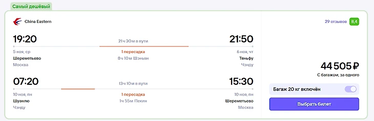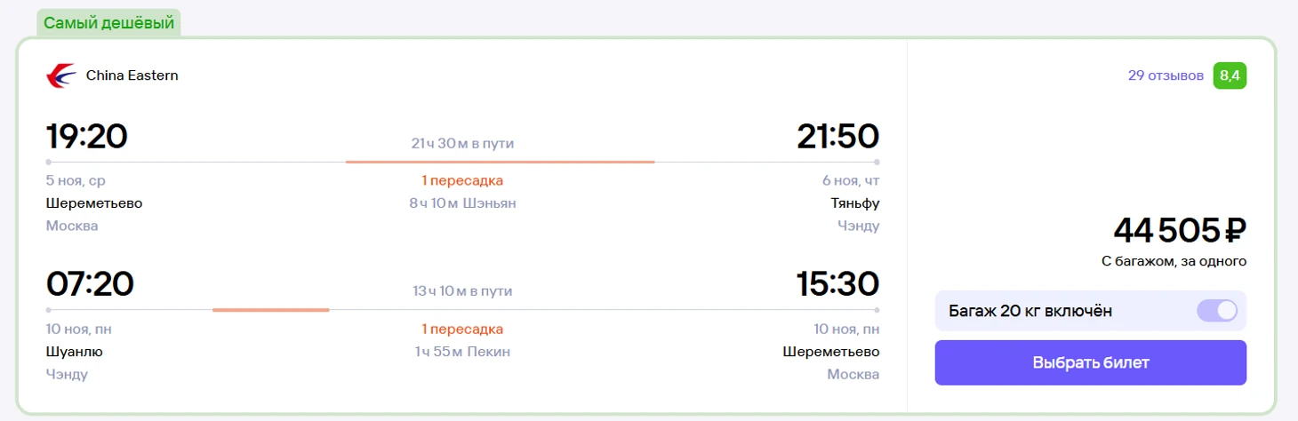 Начнем с авиа-билетов в Китай. Полет будет осуществляться из Москвы. Один из самых дешевых вариантов мы нашли за 44 000 ₽. Мы сопоставляли доверие к авиаперевозчику, цену и качество. Вы вылетаете 5 ноября с Москвы и прилетаете 6 ноября. (С одной пересадкой). Обратите внимание, что чем позже вы покупаете билеты, тем они дороже будут стоить! Ссылка на билеты.