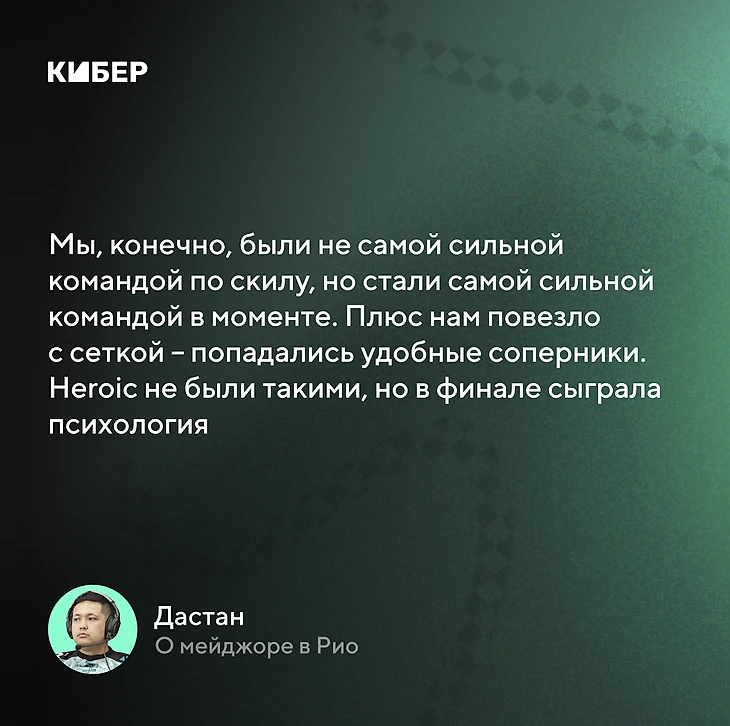 – Мне кажется, сыграла аура Рио. Мы до этого выигрывали там DreamHack и чувствовали эту ауру снова. В целом, что я могу сказать о той победе: мы, конечно, были не самой сильной командой по скилу, но стали самой сильной командой в моменте. Плюс нам повезло с сеткой – попадались удобные соперники. Heroic не были такими, но в финале сыграла психология.