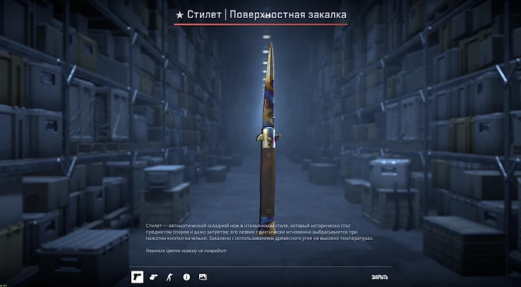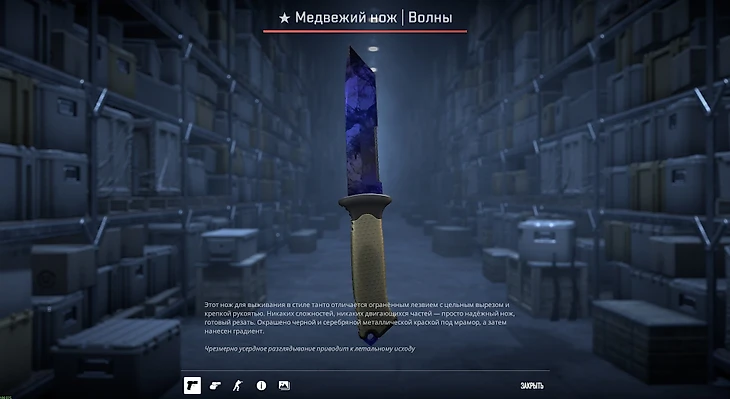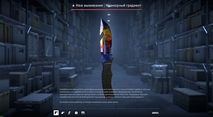 Может, скин и неброский, но разнообразие анимаций точно не позволит вам скучать. А гипнотические переливы на лезвии, возможно, не позволят даже оторваться от скриншота.