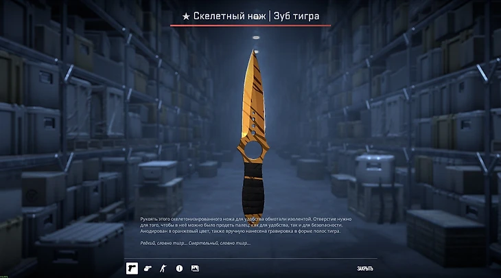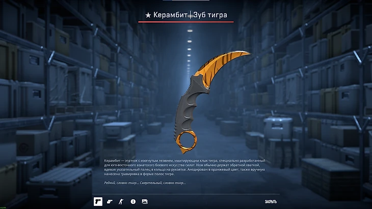 Одно название этой модели ножа уже вызывает волнительный трепет. Правда, цена тоже его вызывает. Но если решитесь потратиться на этот керамбит, он вознаградит вас имитацией клыка мифического золотого тигра.