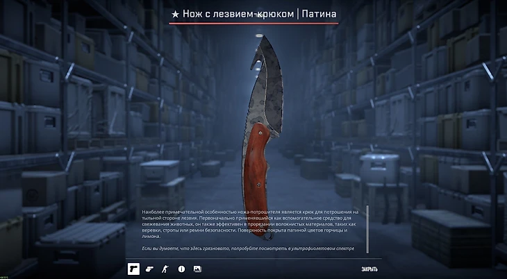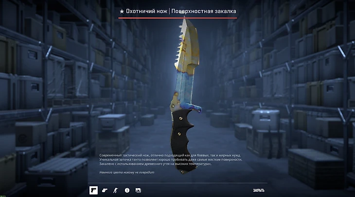 Фальшион привлекает и необычной формой, и интересной анимацией осмотра скина. В данном случае он еще и закален с использованием древесного угля на высоких температурах – а значит, и цена за такой нож должна быть высока.