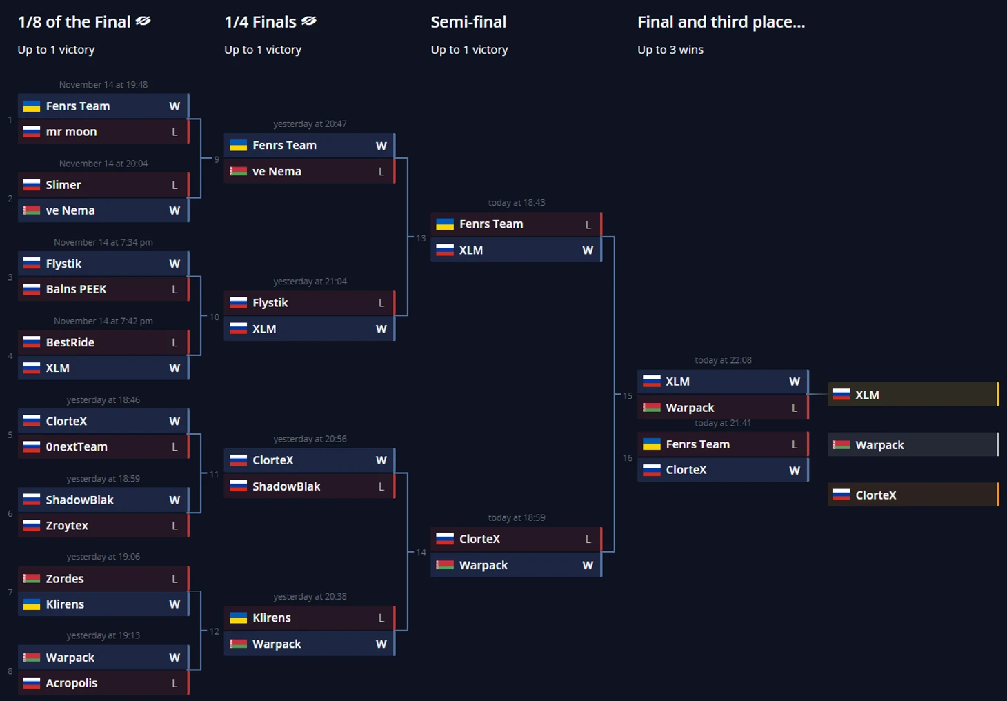 Но на этом наш путь не закончился! Мы не сдались и продолжили борьбу за призовое место – в матче за 3-4 место (third place playoff) против команды Fenrs Team. И мы сделали это! После двух напряженных карт, ClorteX одержал уверенную победу, забрав бронзу турнира! Это достойный результат, который показывает наш потенциал и стремление к победам.