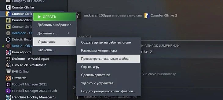 Откройте папку с файлами CS 2. Найти ее можно в библиотеке Steam: кликните правой кнопкой мыши по CS, затем «управление» и «Просмотреть локальные файлы».