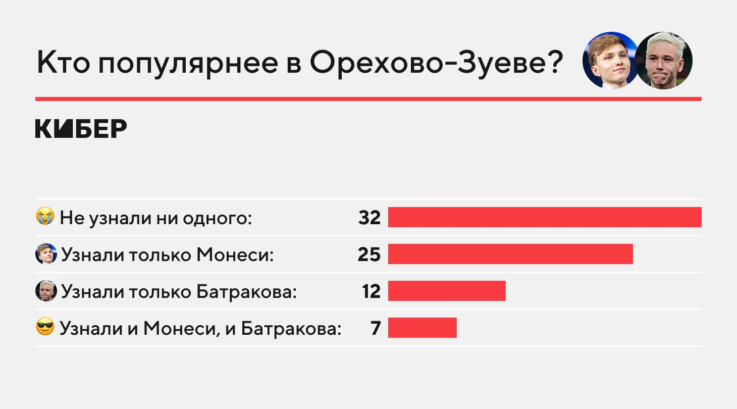 Орехово-Зуево – родина главной звезды РПЛ Алексея Батракова и одного из главных каэсеров мира Ильи «M0nesy» Осипова. Парни даже родились в один год. Но кто из них популярнее у молодежи? А у людей постарше? Есть ли у киберспортсмена шанс обогнать по популярности футболиста? Ответы на эти вопросы я и хотел найти в городе, где зародился русский футбол.