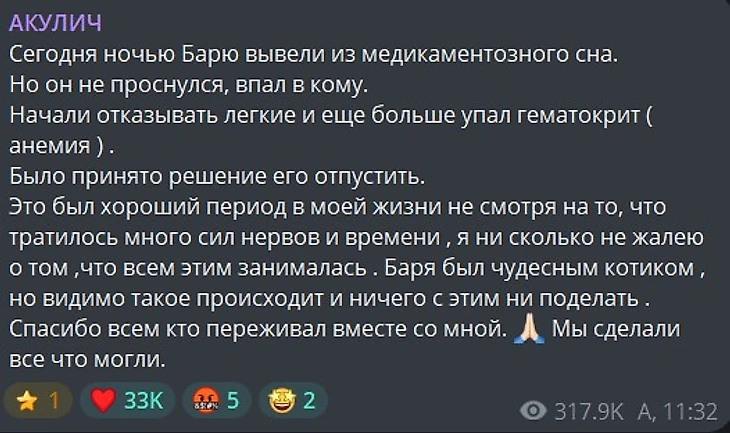 21 августа 2023 года кот Баря скончался. Его состояние резко ухудшилось: отек легких, анемия, кома. Чтобы не продлевать страдания питомца, Анна приняла тяжелое решение его отпустить.