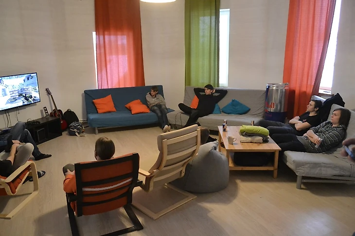 Дом состоит из пяти этажей: на первом находится стол для настольного тенниса, на втором — игровые помещения, на третьем — лаунж-зона и столовая, еще выше — комнаты, где ночевали журналисты и стафф, а на самом верху оборудовали студию для трансляции. На протяжении всех четырех игровых суток на кухне работал шеф-повар одного из московских ресторанов, который умудрялся побеждать голод более чем шестидесяти человек ежедневно. При этом очень даже вкусно, четыре раза в день и с учетом пристрастий и диет всех участников события. Как ему это удалось — уму непостижимо.