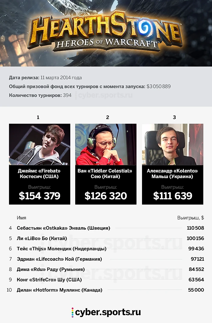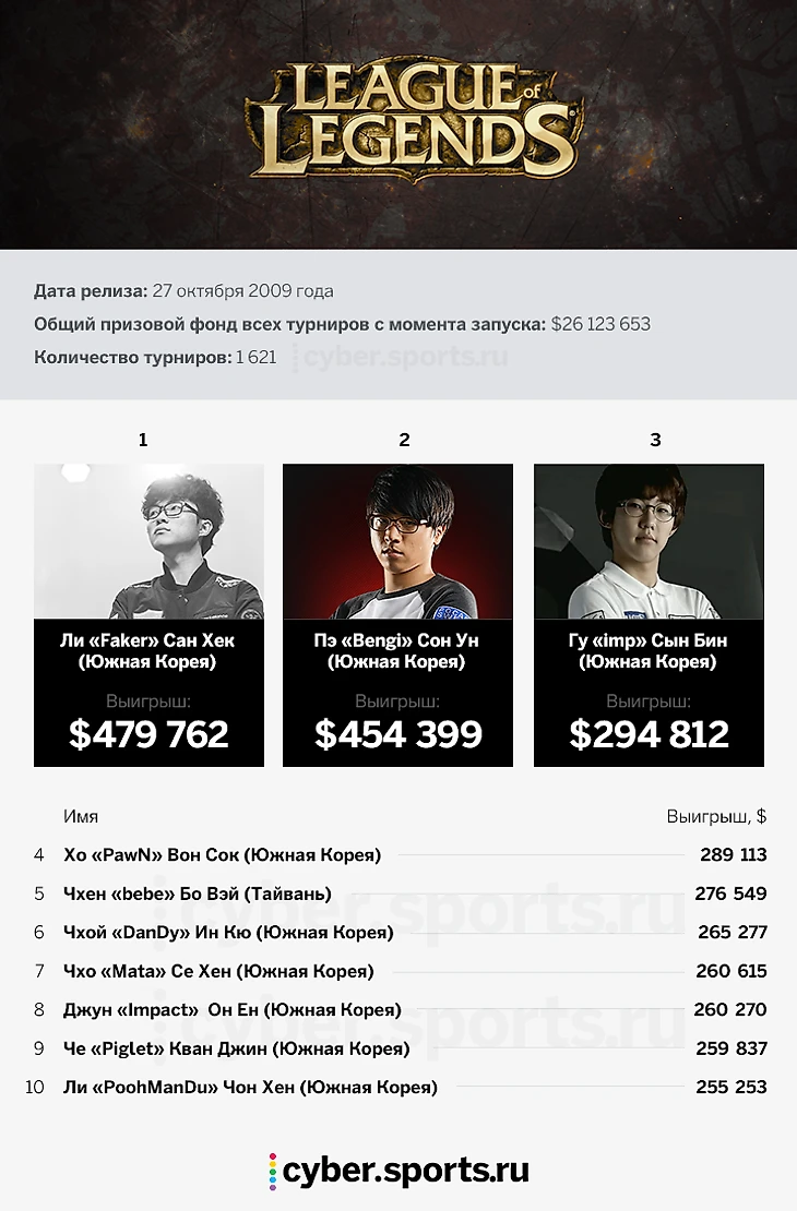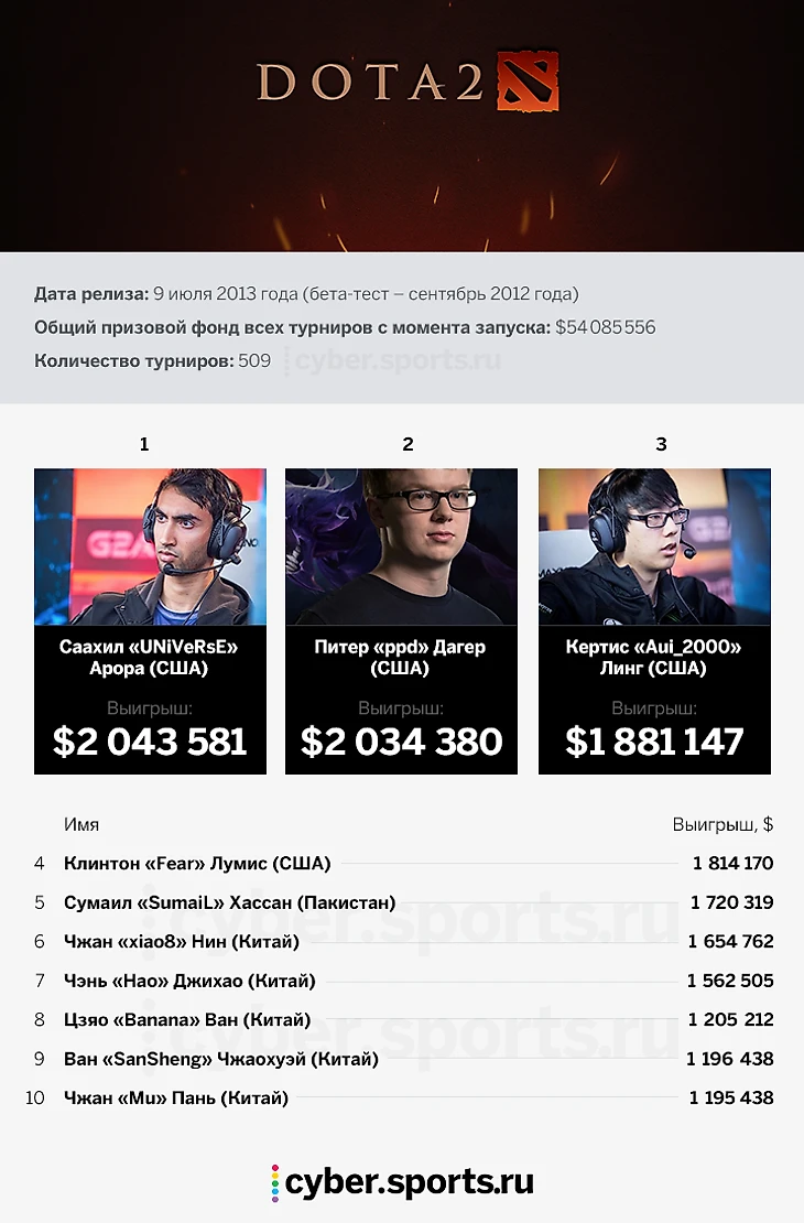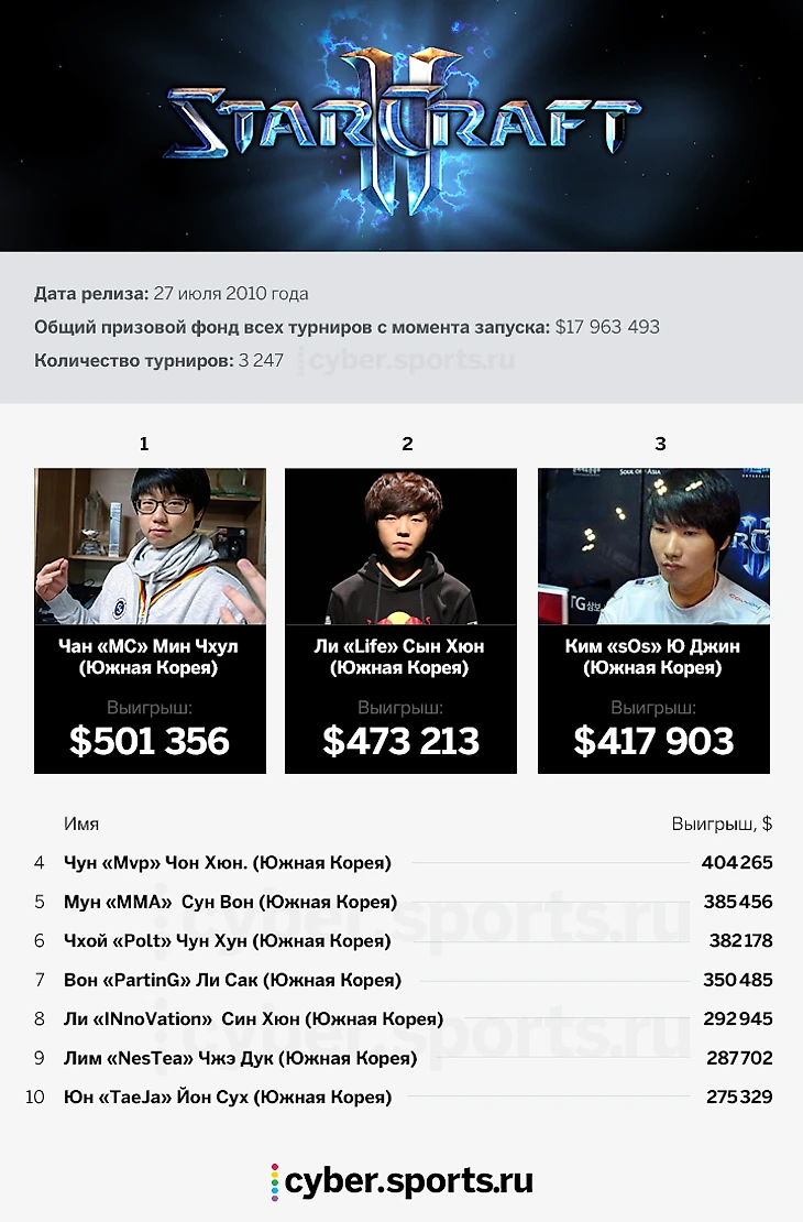 Для подсчета рейтинга использовались только деньги, заработанные за победы в официальных турнирах без учета налоговых выплат. Так как в общем списке первые места заняли бы победители турниров по Dota 2 (именно в ней самые большие призовые в киберспорте), мы разделили самых богатых игроков по дисциплинам. Итак, самые богатые киберспортсмены в CS:GO, Dota 2, Hearthstone, League Of Legends и Starcraft 2.