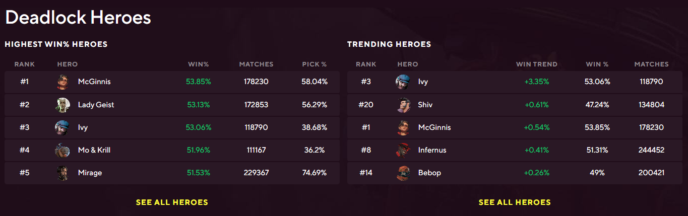 Лучшими героями, по статистике BLAST, являются McGinnis, Lady Geist, Ivy, Mo & Krill и Mirage.
