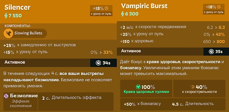 Позволяет играть против «плотных» героев с помощью баффа на кражу здоровья. Вы будете стрелять по врагам и моментально лечиться, а стрелять вы будете долго за счет повышения боезапаса и скорострельности.