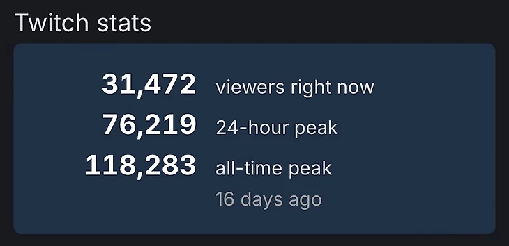 Смотрибельность: Даже сейчас несмотря на Интернешнл по доте в среднем онлайн Deadlock на Twitch держится в районе пятидесяти тысяч, для сравнения у CS 2 онлайн на Twitch в районе ста семидесяти тысяч.