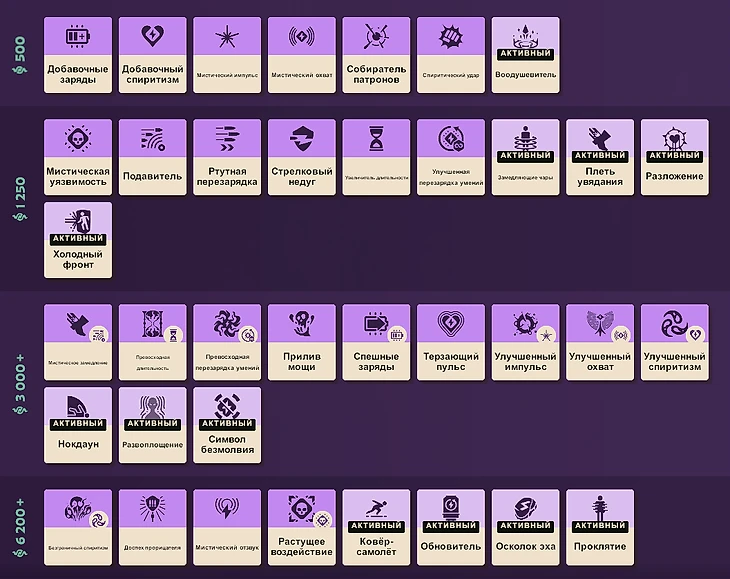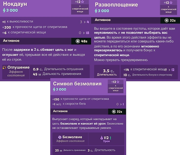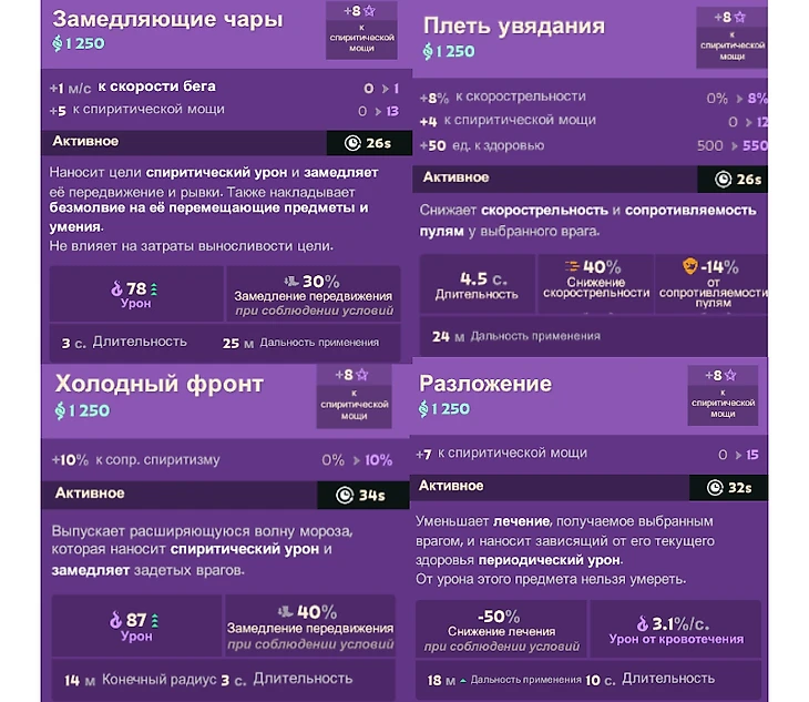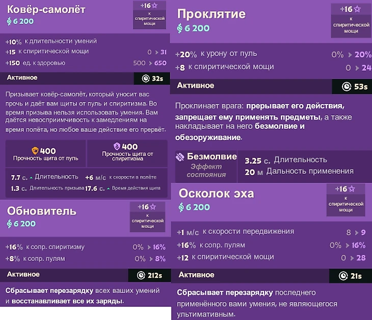 Улучшения или предметы на мистику покупаются в основном на героев, которые не хотят настреливать с руки и собираются через урон со способностей. Еще эти активки контрят неприятных в бою персонажей, например Seven или Warden.