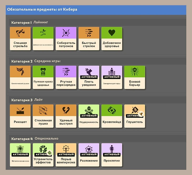 • опционально (под вражеский пик): разложение, металлическая кожа, порыв вампиризма, устранитель эффектов, проклятие.