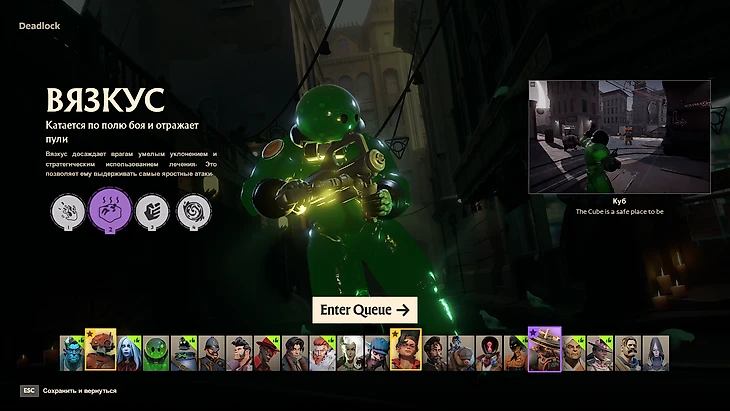 Если вы играли против Вязкуса, то уже в курсе, какой раздражающий у него кубик. Вроде бы уже добил героя, чуть-чуть осталось, а он взял и подлечился за несколько секунд. А ведь герой может превращать в кубик своих союзников, к тому же подбрасывать их на зеленом кулаке. Чтобы реализовать Вязкуса полностью, нужно тренироваться, но потенциал у него как у саппорта довольно велик.