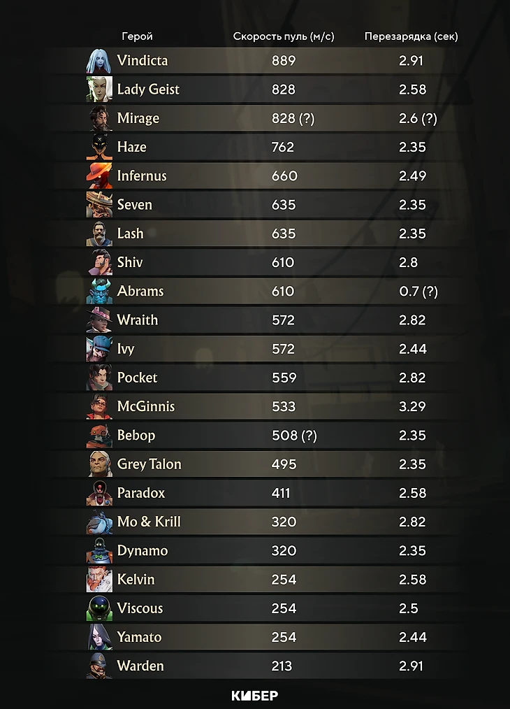 С минимальной перезарядкой и при этом максимальной скоростью стреляют Haze, Seven и Lash. Героям действительно нужно много денег, на линии они могут доминировать. Емкость магазина не учитываем, так как, помимо вас, крипов бьют и вражеские свечки.