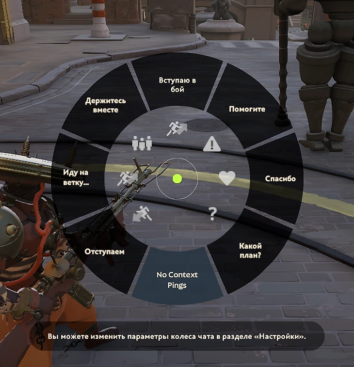 В нижней части колесика находится особенная контекстная фраза, она меняется в зависимости от ситуации. Например, если вы нажмете на нее, когда несете Урну с душами, то персонаж попросит союзников помочь с Урной.