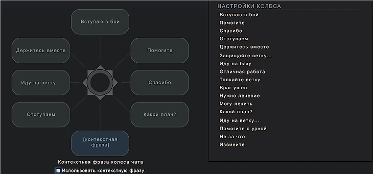 Всего на колесе мыши 8 слотов для быстрых команд, всего в игре 17 фраз: