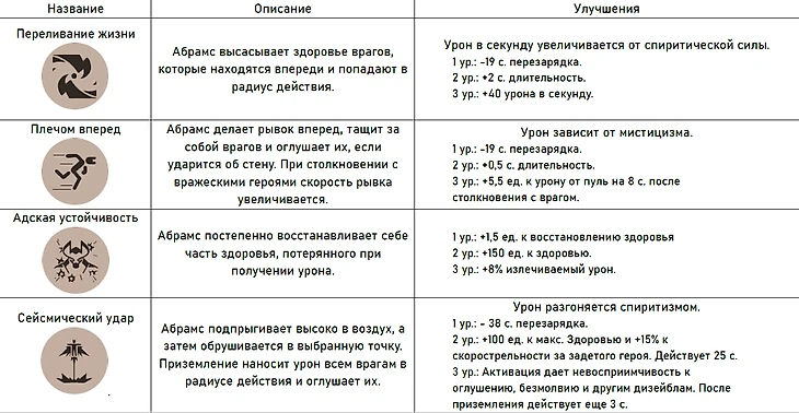 Контрится Абрамс предметами, снижающими восстановление здоровья, в частности Разложением или токсичными пулями. Из контр-пиков выделим Виндикту и Грей Талона: оба сражаются на большой дистанции, поэтому детективу тяжело к ним подобраться.