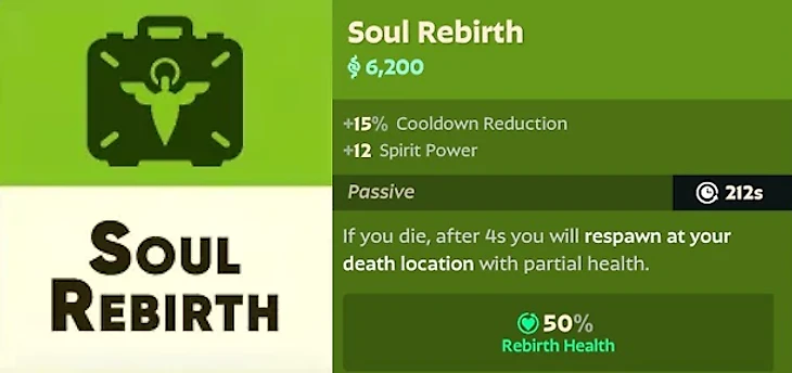Пассивное действие: если игрок умер, то в течение 4 секунд он возродится на месте смерти с 50% здоровья.