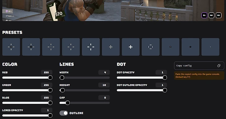 Сейчас настраивать прицел гораздо проще, чем пару месяцев назад: готовые варианты настроек есть на специализированном сайте. Там же можно создать новые конфигурации. Копируете их с сайта, затем вбиваете в консоль в игре (F7). Изменяются следующие свойства прицела: