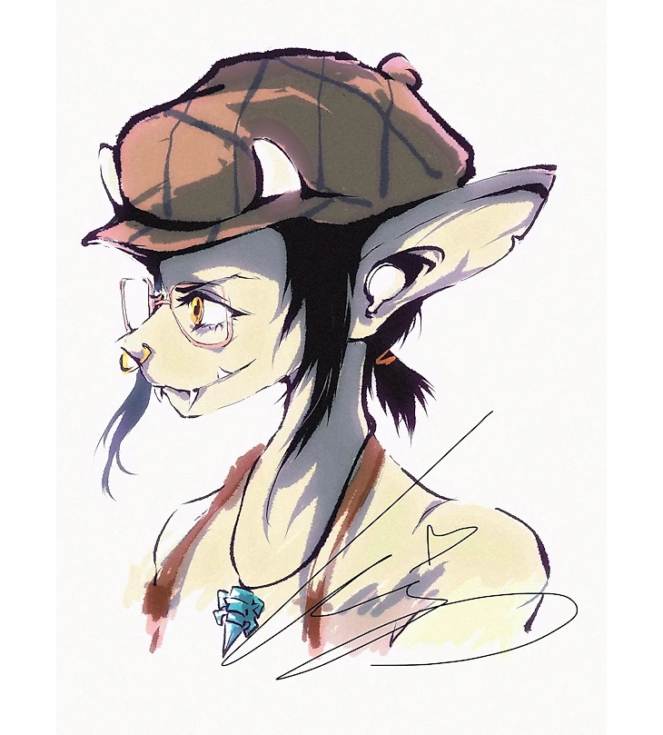 Фантазия на тему того, если бы Айви превратилась в существо, более близкое к человеку. Хрупкая девушка с эльфийскими ушами и интересным кулоном, острыми зубками. Судя по всему, это рисунок маркерами или акварелью. Талантливое исполнение! Получилась хрупкая девушка с игривым взглядом.
