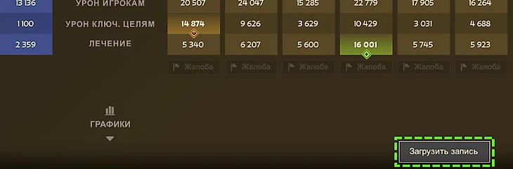 Для просмотра реплея нажмите кнопку «Загрузить запись» в меню отчета после матча, затем откроется доступ к просмотру записи. Реплей доступен не сразу, а только через час после игры. Если вы хотите посмотреть старую игру, то найдите отчет по ней в истории матчей.