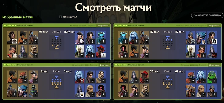 В главном меню игры есть вкладка «Смотреть». Здесь показаны текущие матчи (с задержкой) от наиболее популярных игроков, скорее всего, список составляется от количества зрителей. Помимо этого, можно выбрать фильтр на матчи друзей или выполнить поиск игры по номеру.