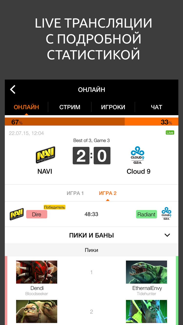 • Live-трансляции всех матчей The International 5 с подробной статистикой;