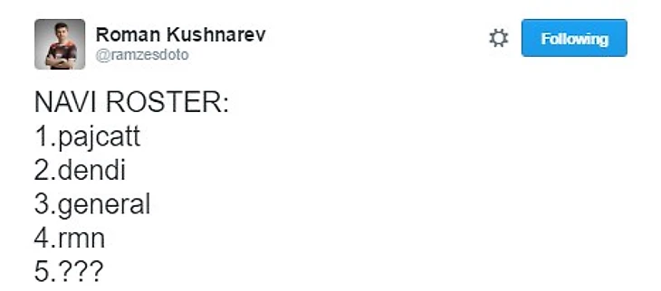 Игрок Virtus.Pro Роман «RAMZES666» Кушнарев написал в твиттере предполагаемый состав Natus Vincere. Он назвал четверых игроков, которые, по его мнению, точно окажутся в составе украинского коллектива. В этот раз Роман предположил, что новичком команды станет швед Пер Андерс «Pajkatt» Олсен Лилль.