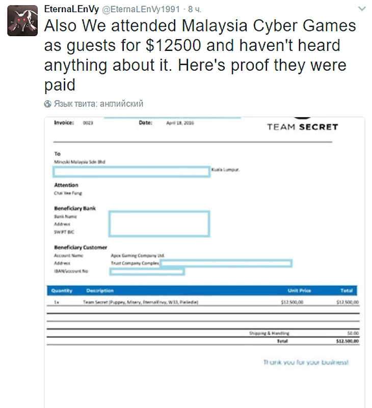 «Также мы посетили Malaysia Cyber Games в качестве гостей и получили $12 500, однако об этом ничего не слышали».