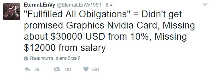 «Выполненные обязательства = не получил обещанную видеокарту, где-то $30 000 от положенных 10% призовых и $12 000 из зарплаты».